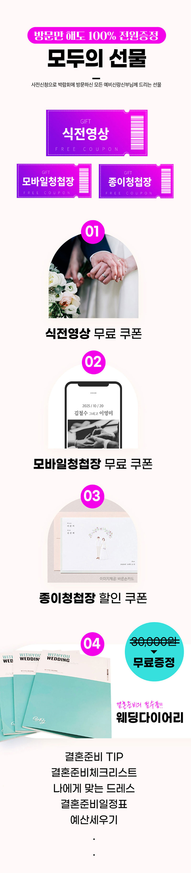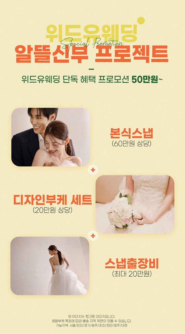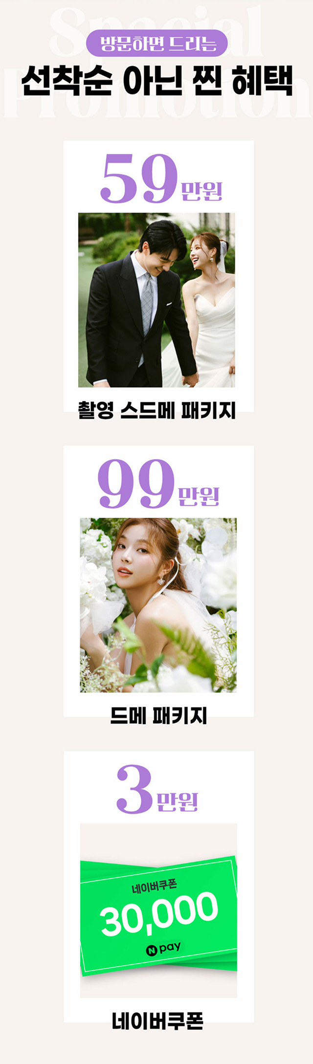 본 프로모션 페이지는 "더퍼스트웨딩"의 프로모션 대행사인 '소나미디어'의 'CPAAD'서비스를 통해서 시행되고 있습니다. 관계법령에 의거 본 프로모션에 참여하신 고객님의 개인정보는 상품안내(텔레마케팅, 이메일 등)의 마케팅에 활용됩니다.