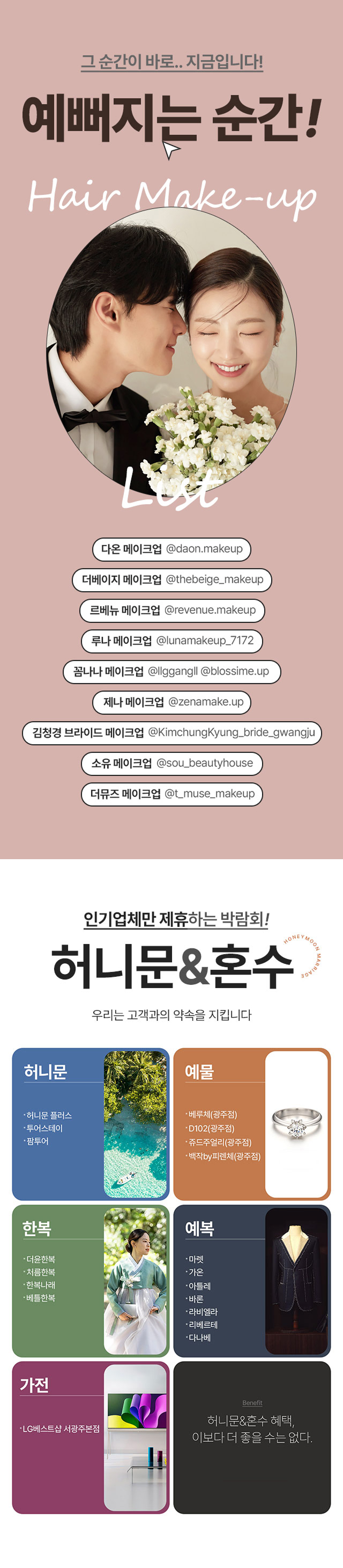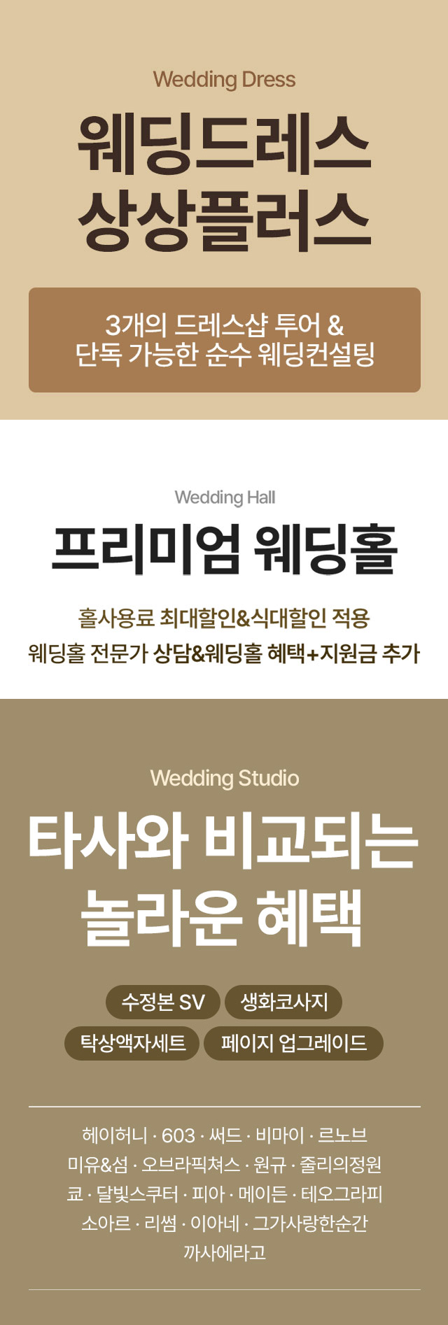 본 프로모션 페이지는 "더퍼스트웨딩"의 프로모션 대행사인 '소나미디어'의 'CPAAD'서비스를 통해서 시행되고 있습니다. 관계법령에 의거 본 프로모션에 참여하신 고객님의 개인정보는 상품안내(텔레마케팅, 이메일 등)의 마케팅에 활용됩니다.