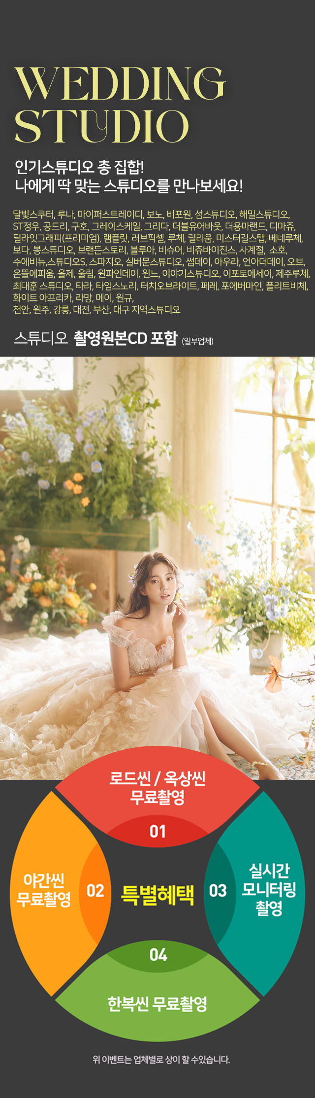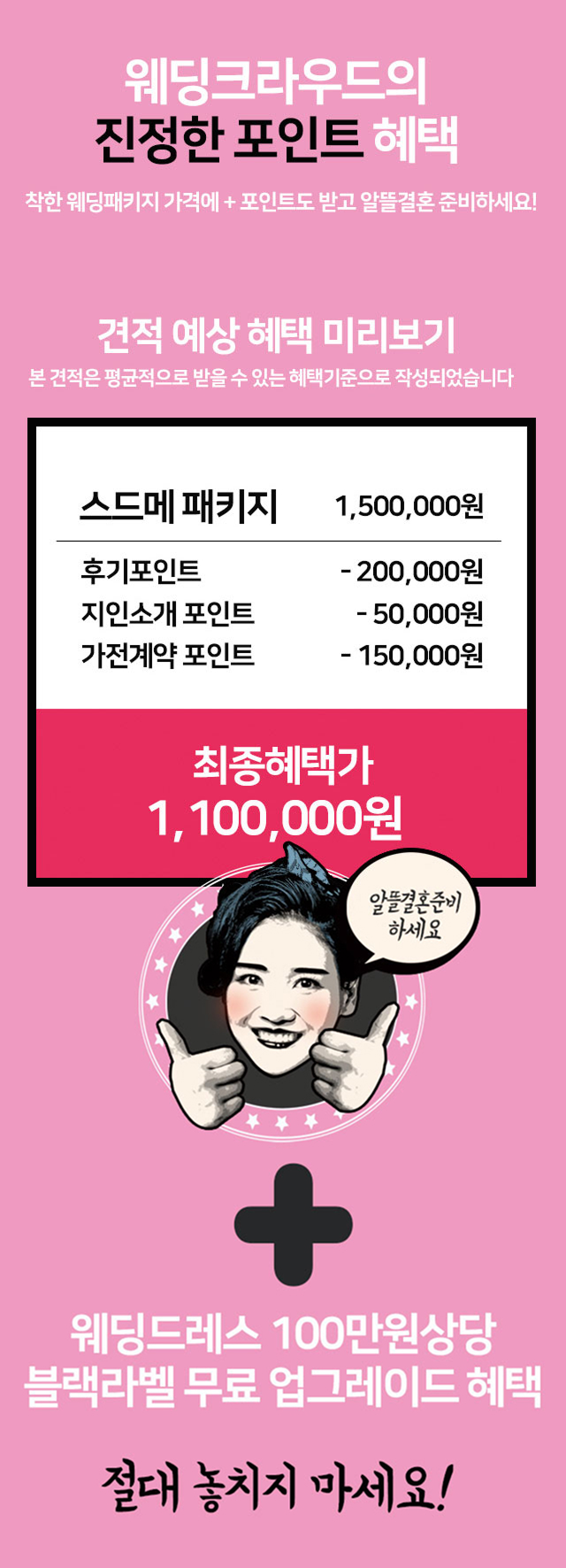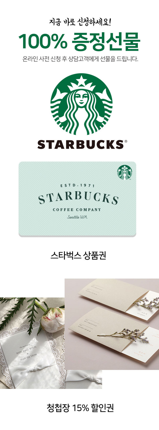 본 프로모션 페이지는 "더퍼스트웨딩"의 프로모션 대행사인 '소나미디어'의 'CPAAD'서비스를 통해서 시행되고 있습니다. 관계법령에 의거 본 프로모션에 참여하신 고객님의 개인정보는 상품안내(텔레마케팅, 이메일 등)의 마케팅에 활용됩니다.