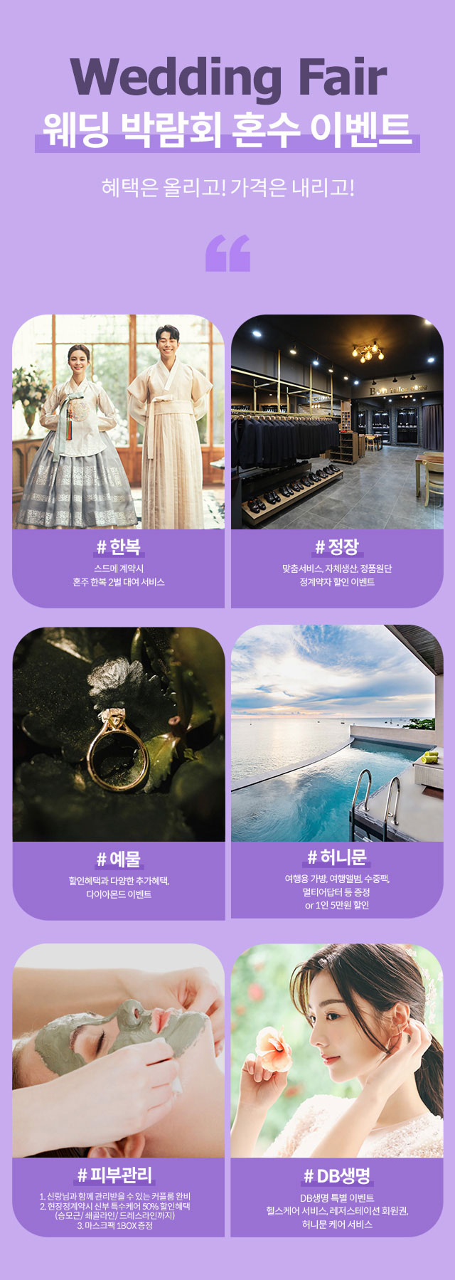 본 프로모션 페이지는 "더퍼스트웨딩"의 프로모션 대행사인 '소나미디어'의 'CPAAD'서비스를 통해서 시행되고 있습니다. 관계법령에 의거 본 프로모션에 참여하신 고객님의 개인정보는 상품안내(텔레마케팅, 이메일 등)의 마케팅에 활용됩니다.